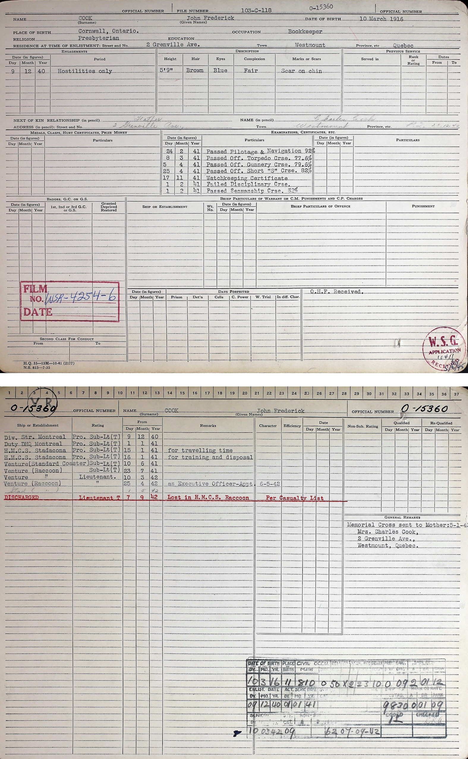 COOK, John Frederick, Lt, RCNVR, MPK - 07 Sep 1942, HMCS RACCOON - Son of Charles James Cook and Mabel G. Cook, of Westmount, Quebec.