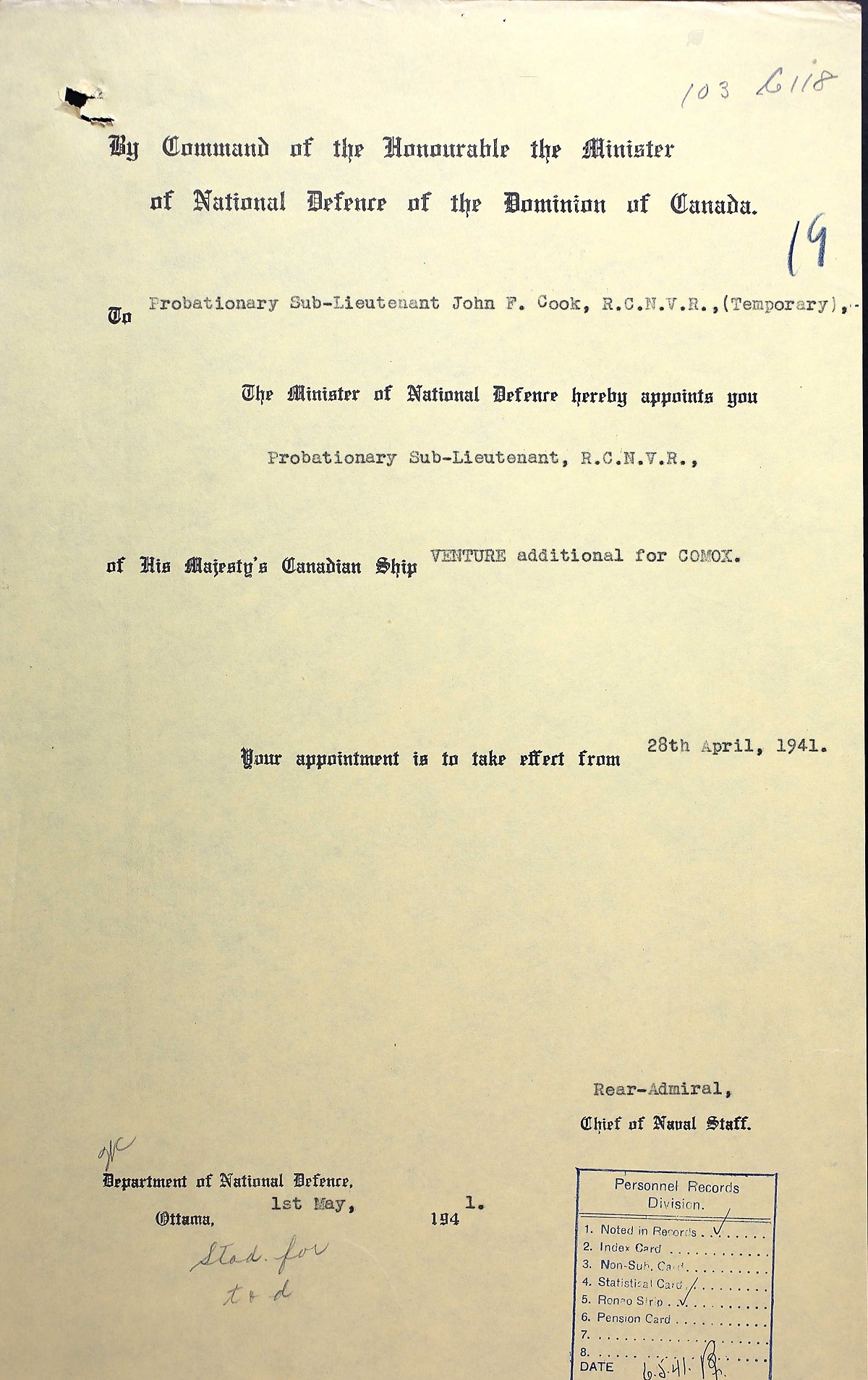 (JC01) Record of Service (JC02) Appointment Certificate to HMCS COMOX (JC03-JC05) Telegram and letters to Lt Cook's father