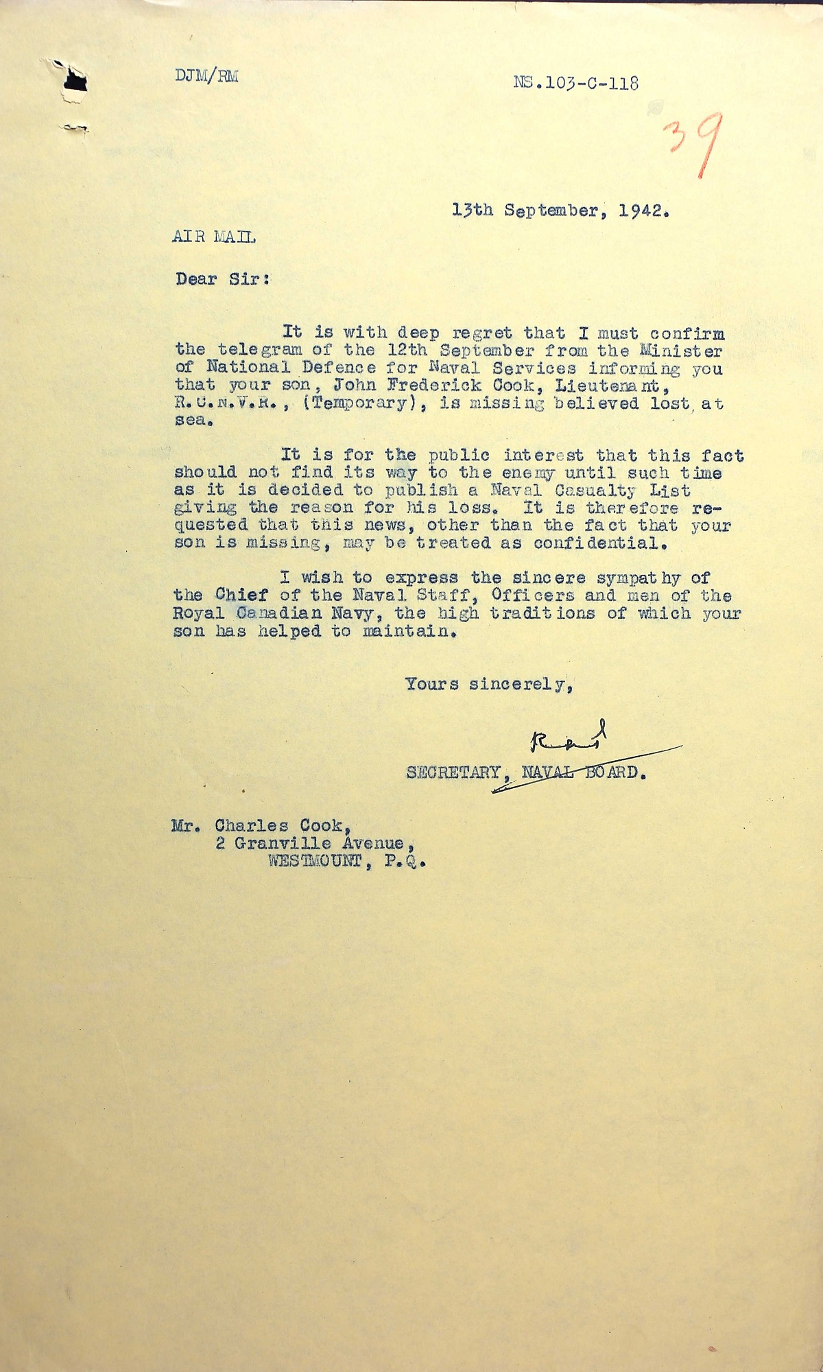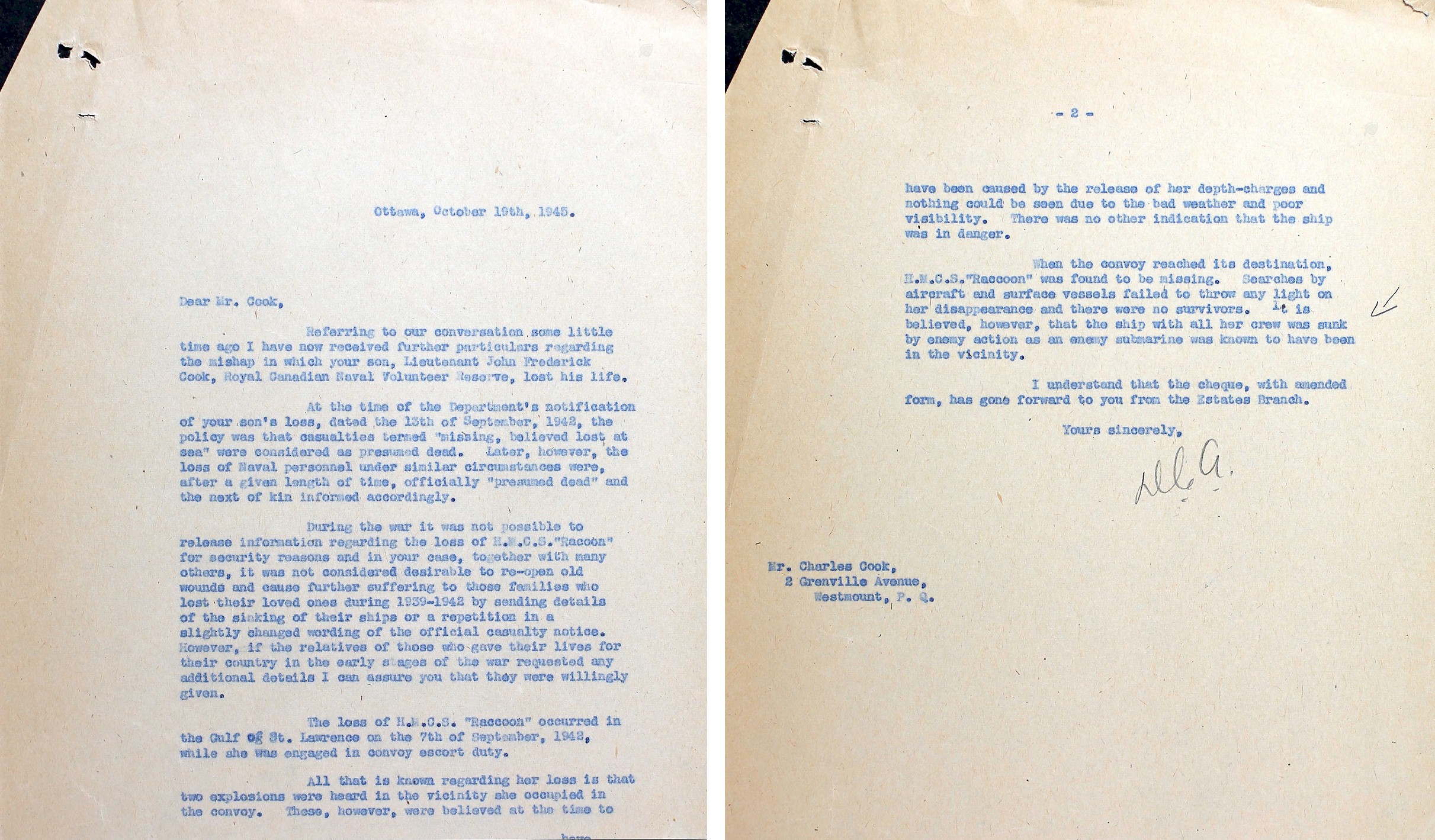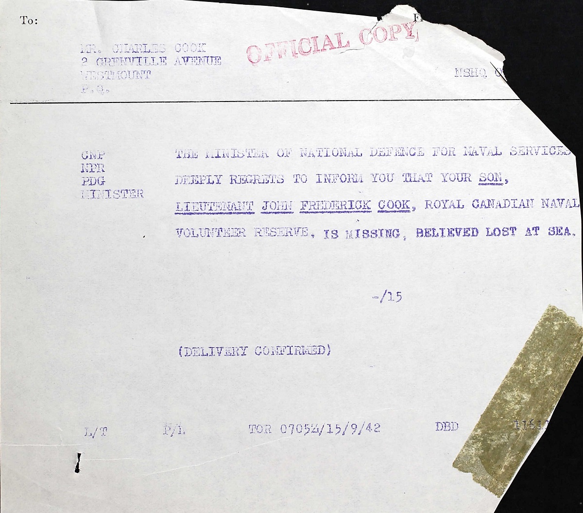 Lt Cook died when his ship, HMCS RACCOON, which was on convoy escort in the St. Lawrence River off the Gaspé Peninsula, was hit and sunk by two torpedoes from U165. All 37 hands were lost.