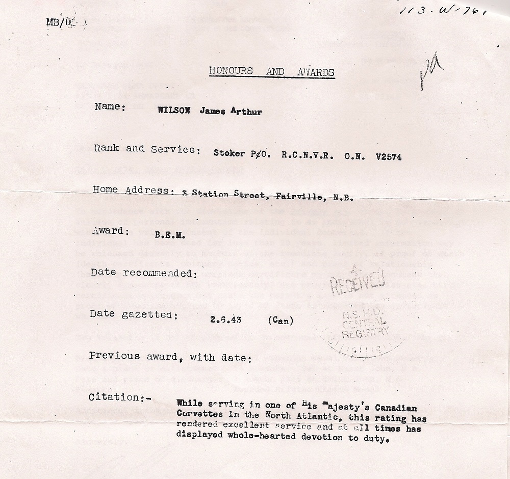 "While serving in one of His Majesty's Canadian Corvettes in the North Atlantic, this Rating has rendered excellent service and at all times has displayed wholehearted devotion to duty."