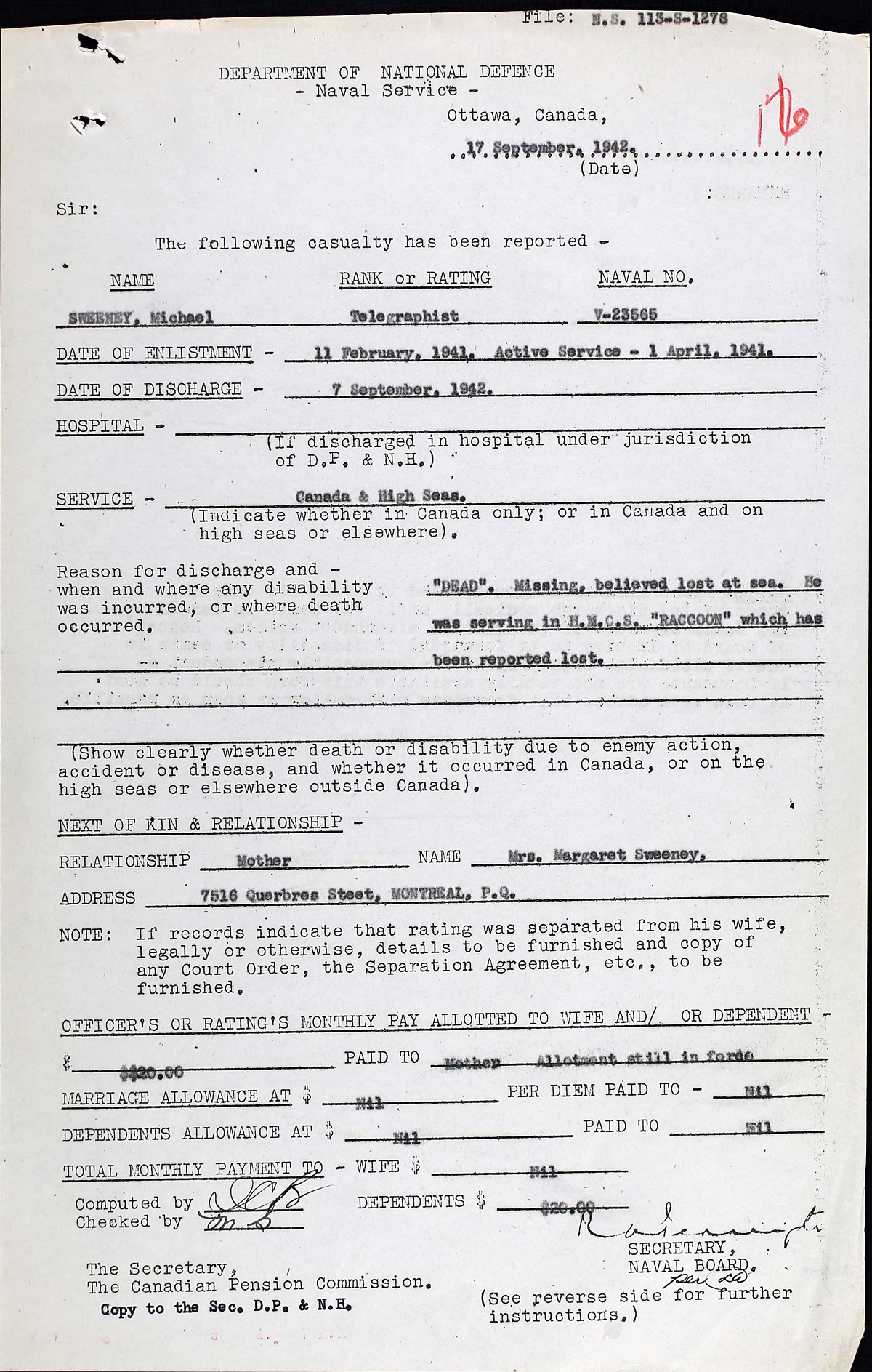 SWEENEY, Michael, Tel, V23565, RCNVR, MPK - 07 Sep 1942, HMCS RACCOON - Son of Thomas and Margaret Sweeney, of Montreal, Quebec.