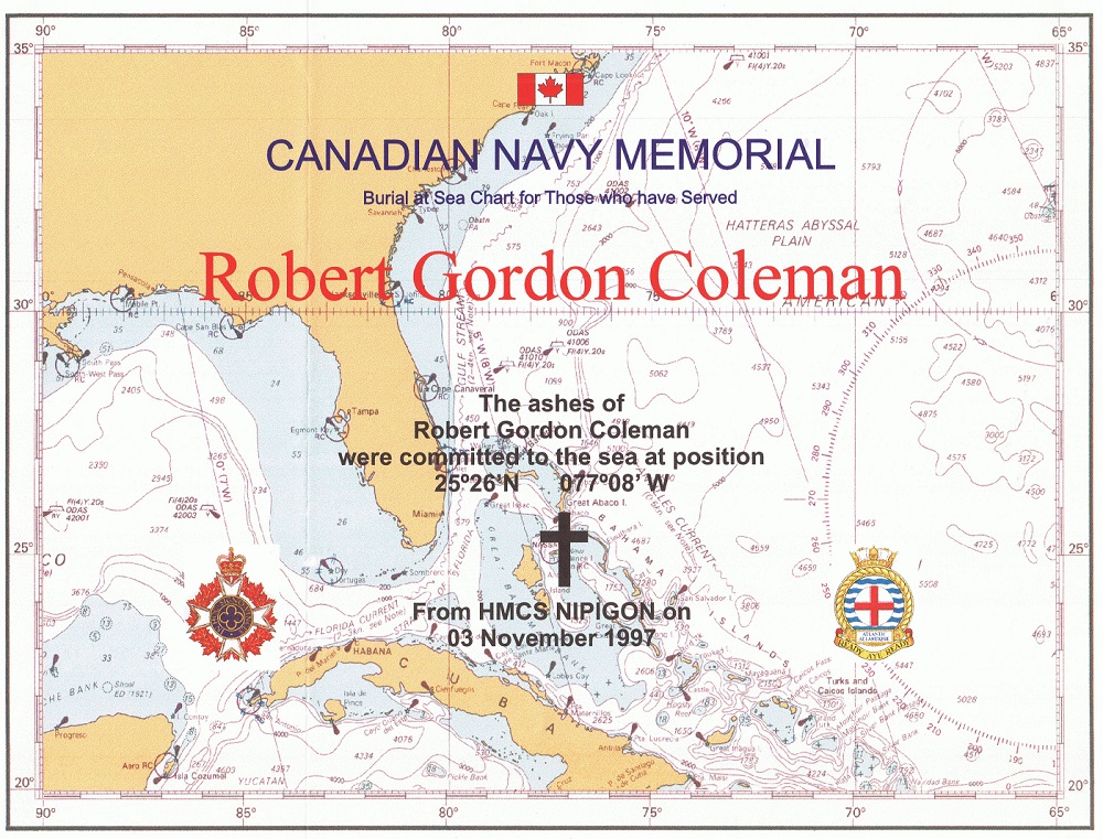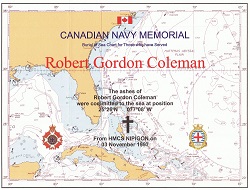 COLEMAN, Robert Gordon - Peacefully in hospital on Thursday, August 7, 1997, age 79 years. Beloved husband of the late Jean (nee Silmser). Loving father of Jane (Frank Longo) and Sue (John Horsley). Dear grandfather of Stephen (Jessica Holland), Jeffrey and Pamela. Friends may visit at the Central Chapel of Hulse, Playfair & McGarry, 315 McLeod Street on Monday from 2 to 4 and 7 to 9 p.m. Funeral service at St. David & St. Martin Presbyterian Church, 444 S. Laurent Blvd., on Tuesday at 2 p.m. In lieu of flowers donations to the Canadian Cancer Society or the charity of your choice would be appreciated. Robert's ashes were committed to the sea from HMCS NIPIGON on 03 Nov 1997.