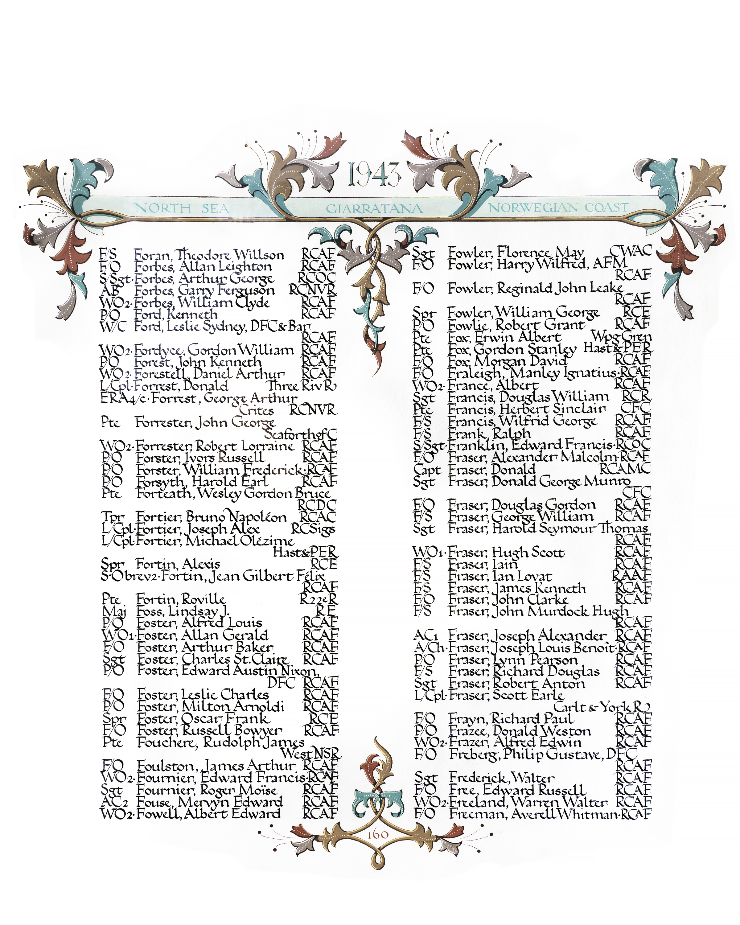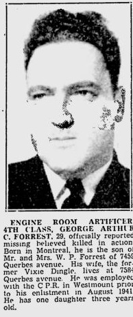 FORREST, George Arthur Crites, ERA 4c, V33125, RCNVR, MPK - 06 Feb 1943, HMCS LOUISBURG - Son of William P. and Maud Mae (née Simser) Forrest, of Montréal, Québec; brother of William and Gladys. He was the loving spouse of Valerie Olive (née Dingle)Forrest, of Montréal, Québec. Father of Jeffrey George and Judith Priscilla. Prior to enlistment, Engine Room Artificer Forrrest was in the employ of the Canadian Pacific Railway as a 'call-boy'. The basic prerequisite for the job was to own a bicycle. His responsibilities were to go around ringing doorbells, at the homes of train crews, to advise them that their presence was required to be on duty as a certain time (Telephones were not as ubiquitous as they are now). He then worked his way into the CPR shops in the 'Montréal Terminals' region of the CPR. Having a strong mechanical aptitude, he apprenticed and became a 'Fitter' or journeyman steam fitter. He earned his certification while working at the 'Outrement' shops and roundhouse. His apprentice certificate was issued on January 12, 1940. It states that he served his apprenticing years from May 14, 1930 to May 20, 1936.