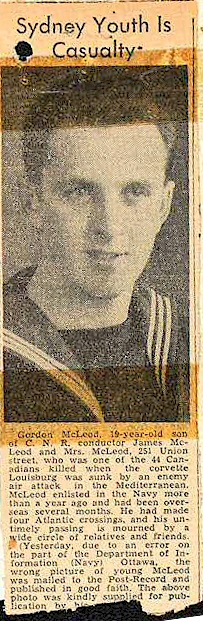 MACLEOD, Gordon Irwin, Sig, V319, RCNVR, MPK - 06 Feb 1943, HMCS LOUISBURG - Son of James D. and Florence MacLeod, of Sydney, Nova Scotia.
