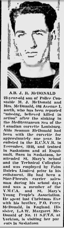 MCDONALD, Ronald Joseph, AB, V11491, RCNVR, killed - 06 Feb 1943, HMCS LOUISBURG - Son of Martin James McDonald and Nellie McDonald, of Saskatoon, Saskatchewan.