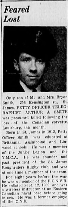 Petty Officer Telegraphist Arthur J. Smith was one of the four Greater Winnipeg seamen reported missing, presumed killed in action following the loss of the Canadian corvette, Louisburg, early this month. He was the only son of Mr. and Mrs. Bryon Smith, 236 Kensington street, St. James. He held the rank of petty officer telegraphist and was a member of the R.C.N.V.R. reserve for eight years prior to the outbreak of war. Petty Officer Smith was born in St. James in 1912 and received his education at Britannia, Assiniboine and Linwood collegiate. He was a member of the junior Legion and the Y.M.C.A., and was founder and past president of the St. James Roughriders Rugby club, and at one time a member of the team. Prior to the outbreak of war he was employed as a clerk in the C.N.R. and enlisted for active service on September 12, 1939. He served for many months as a wireless operator. (Transcription for newspaper article)