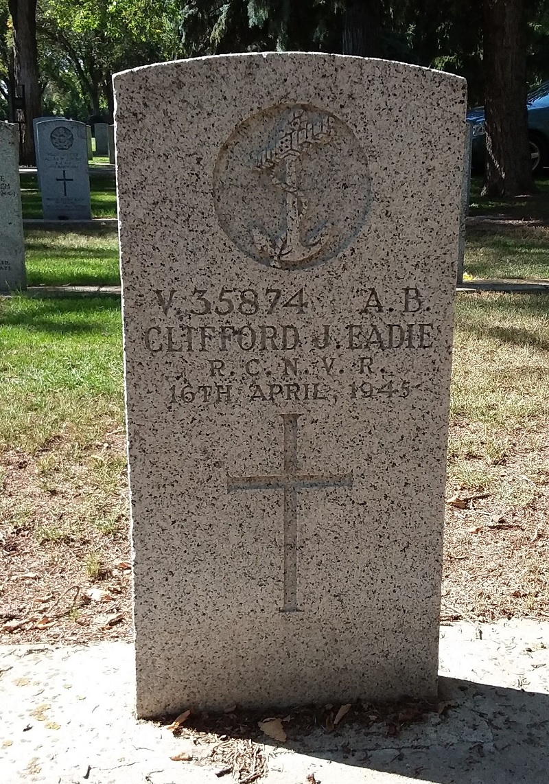 AB Eadie died when his ship, HMCS ESQUIMALT, was torpedoed and sunk by U-190 off the approaches to Halifax harbour. His body was recovered and he was buried in the Woodlawn Cemetery, Saskatoon, Saskatchewan