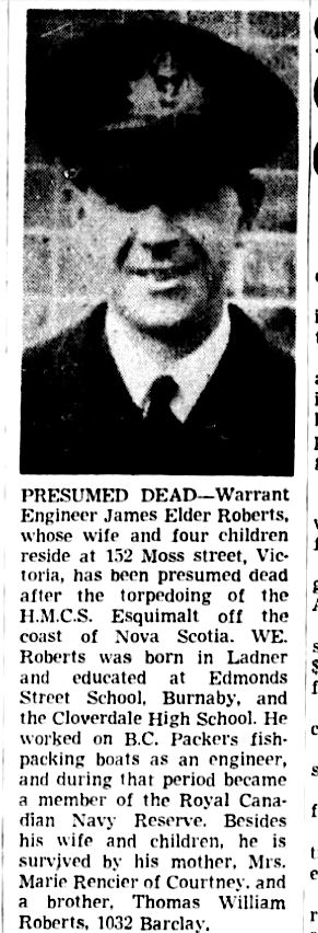 ROBERTS, James Elder, Wt (E), RCNR, MPK - 16 Apr 1945, HMCS ESQUIMALT - Son of Mr. and Mrs. Thomas Roberts, of Kamloops, British Columbia; husband of Anne Roberts, of Victoria, British Columbia.