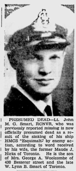 Lt Smart died when his ship, HMCS ESQUIMALT, was torpedoed and sunk by U-190 off the approaches to Halifax harbour.