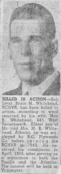 WHITEHEAD, Bruce Mansell, SLt, RCNVR, killed - 16 Apr 1945, HMCS ESQUIMALT - Husband of Betty Whitehead, of Vancouver.