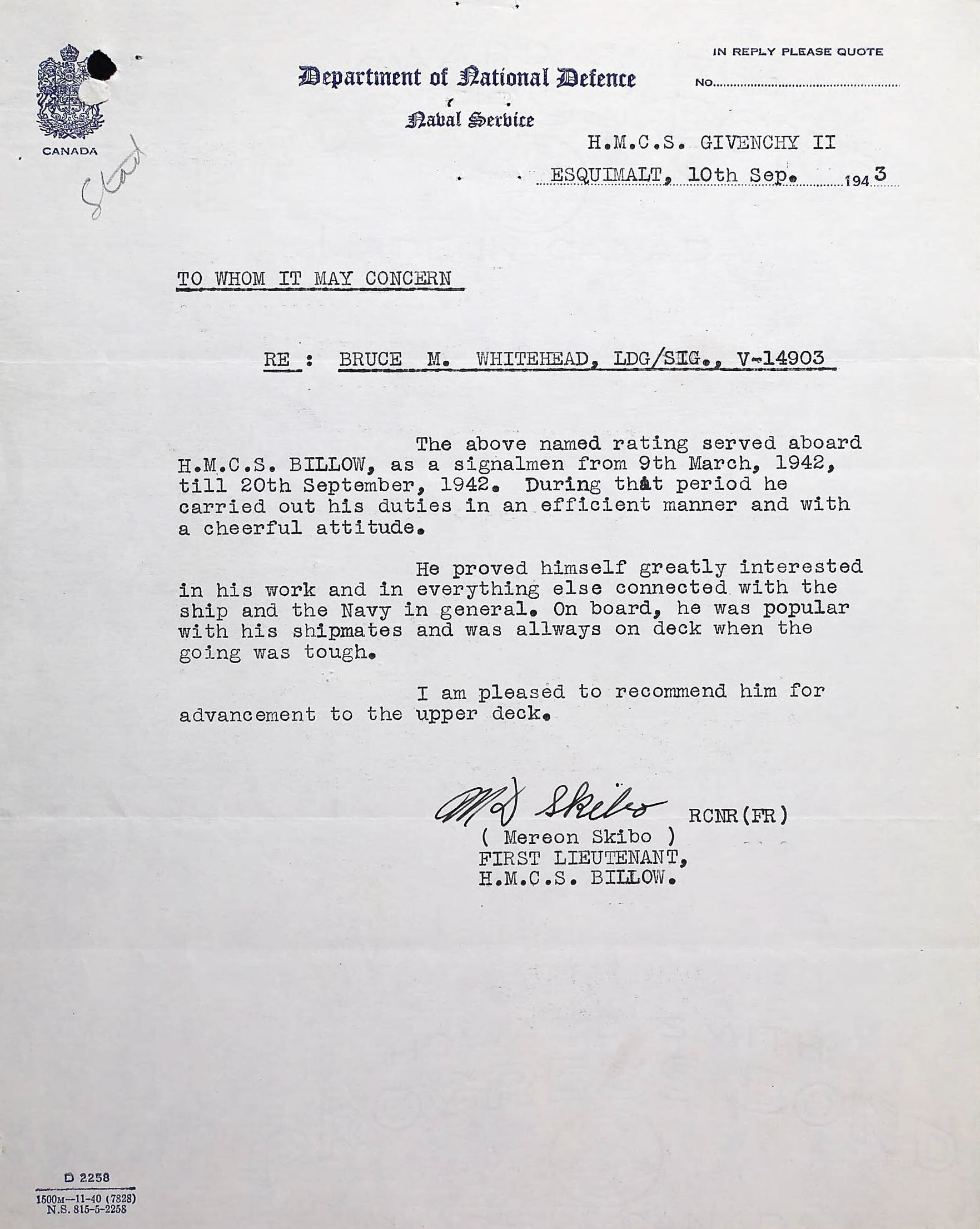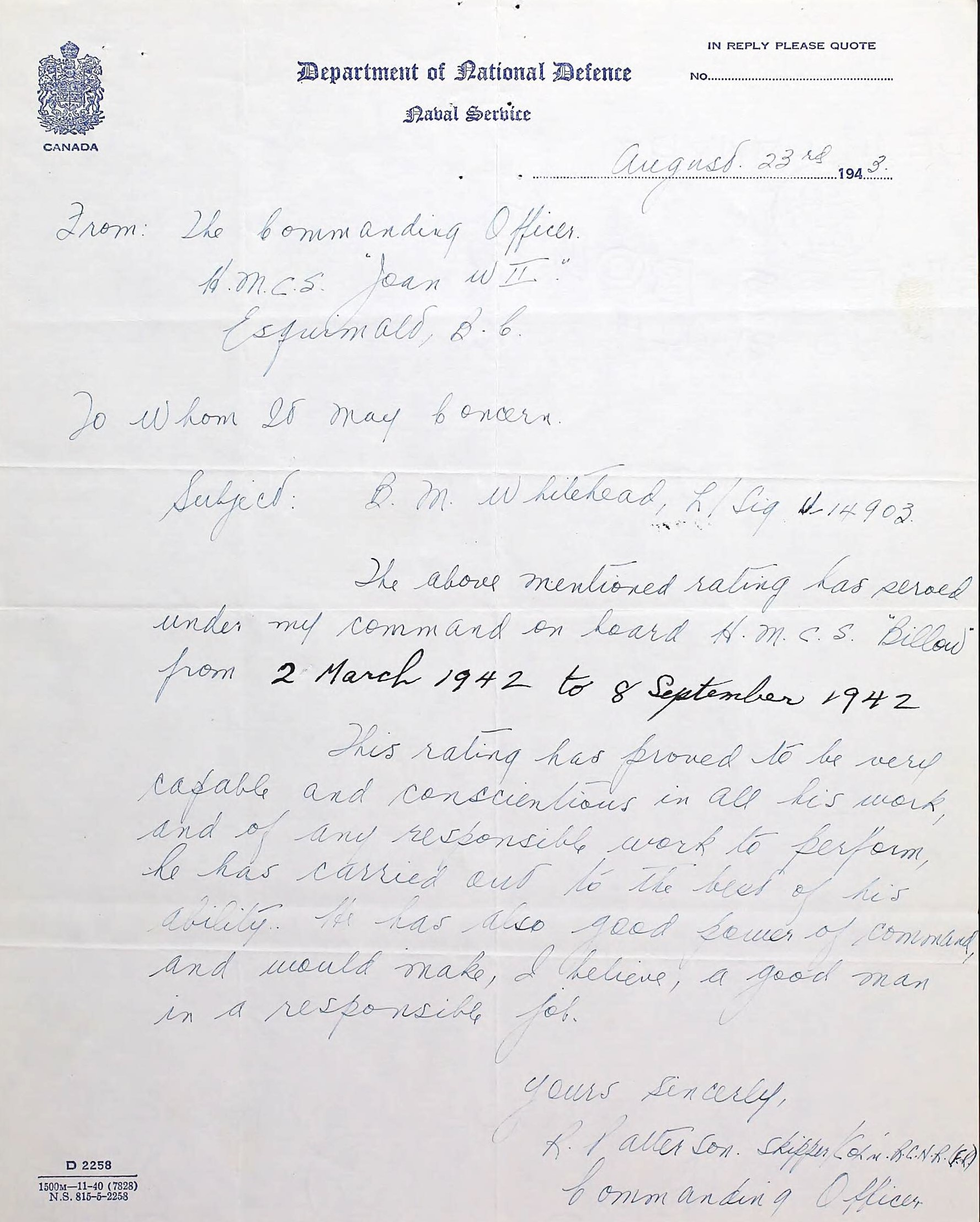 (BW01) Documents from the Service File of Bruce Whitehead (BW02) Article on the death of SLt Bruce Whitehead (BW03) Letter or performance for L/Sig Bruce Whitehead for his time on HMCS JOAN W II - 02 Mar 1942 - 08 Sep 1942. Note that the JOAN W II does not appear on Bruce's Certificate of Service nor his Record of Service. It is possible he was loaned from MOONLOCK to JOAN W II and remained On her after his drafted to BILLOWS, again on loan - without it being records in his file. (BW04) Letter of performance for L/Sig Bruce Whitehead for his time on HMCS BILLOWS - 09 Mar 1942 - 20 Sep 1942 (BW05 Grave marker for SLt Bruce Whitehead Ocean View Burial Park, Burnaby, BC