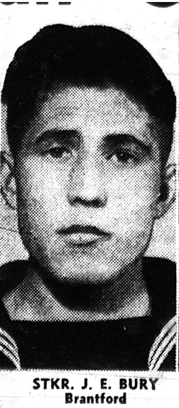 Stoker 1c James Edward Bury, son of Mr. and Mrs. James Bury, 166 Brock St., had been on convoy duty for over two and a half years before he transferred to the minesweeper, H.M.C.S. Guysborough, and on his first voyage aboard this ship lost his life on March 18, 1945, when the Guysborough was lost in the Bay of Biscay. Stoker Bury had begun his naval career nearly four years previous, in September, 1941. He went directly from Brantford to Halifax and, after about six months' training there, was transferred to St. John's Newfoundland, from where he went to sea. Born in Brantford on November 6, 1920, James attended Major Ballachey School and the Brantford Collegiate Institute and Vocational School. He then worked until his enlistment at the Cockshutt Plow Company, Ltd. A member of St. Jude's Anglican Church, he also sang in the choir. Fond of outdoor sports, he followed hockey, football and baseball with keen interest. (Biography – Album of Honour for Brant County World War 11 1939 - 1945 Published in 1946 by The Brantford Kinsmen Club)
