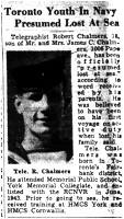(RC01) Photo of Robert Chalmers from an article on HMCS GUYSBOROUGH casualties (RC02) Article on the death of Tel Robert Chalmers (RC03) Documents from the Service File of Robert Chalmers