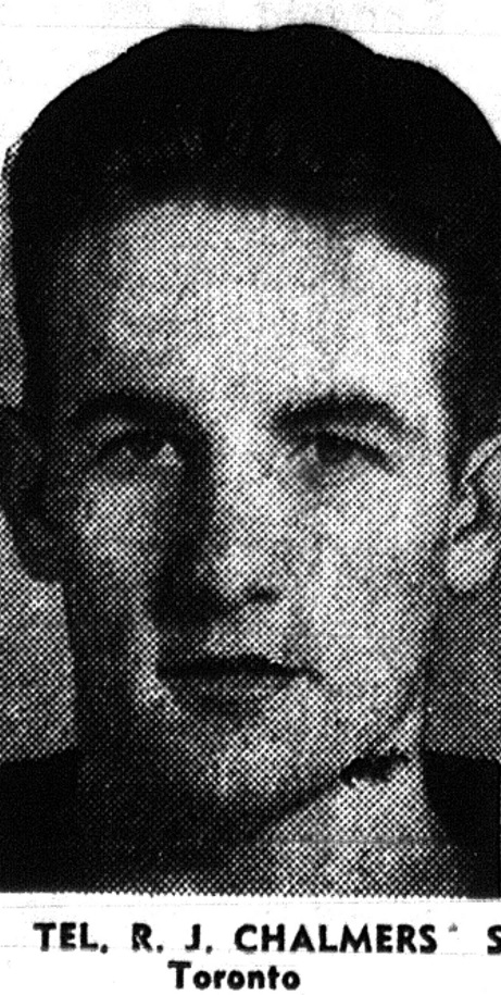 Telegraphist Robert James Chalmers, 18, RCNVR, son of Mr. and Mrs. James Chalmers, Pape Ave., was lost at sea March 23, his parents have been informed. No details were given, "He enlisted 18 months ago," his father said, "and was home on embarkation leave just a few days before his death was reported." Teleg. Chalmers trained at HMCS York and Cornwallis. He was an accordion player and led his own band aboard ship. He was born and educated at Fairbank, and was a member of Fairbank Presbyterian Church. His father served with the Imperial navy in the last war. Surviving are his parents, four sisters, Mrs. Helen Chaplin, Mrs. Nancy Glandfield, Mrs. Barbara Wheeler and Mrs. Marion Patterson, the latter serving for five years overseas with civil defence service, and a winner of the George Medal, and a brother Alexander. (The Toronto Star, 05 Apr 1945)