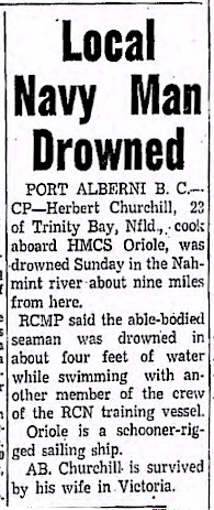 AB Churchill was swept away by strong currents and drowned while swimming in the Nahmint River.