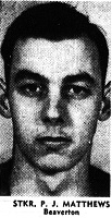 MATTHEWS, Paul Joseph, Sto 1c, V56844, RCNVR, MPK - 18 Mar 1945, HMCS GUYSBOROUGH - Son of James and Hazel Matthews, of Oshawa, Ontario; husband of Ruby Kathleen Matthews, of Beaverton, Ontario.
