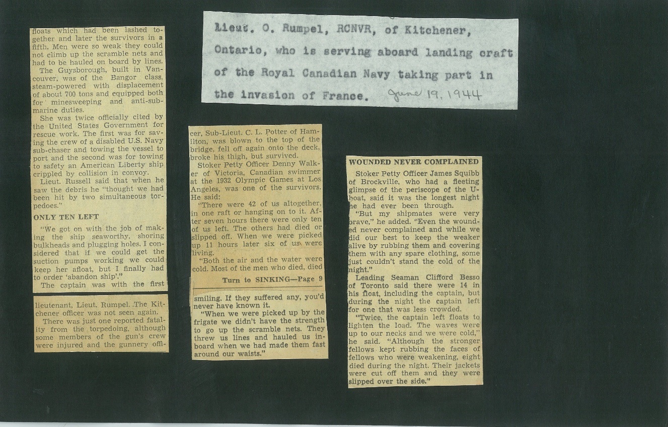 Lt Rumpel died when his ship, HMCS GUYSBOROUGH, was torpedoed and sunk by U-868 in the Bay of Biscay with the loss of 53 of her crew.