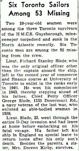 Lieut. Richard Stanley Slade, who was the only original officer other than the captain aboard the ship, left in the second year of commerce and finance course at University of Toronto to enlist in the ranks early in 1940. He was awarded his commission in 1943, thereby stepping ahead of his father, Chief Petty Officer George Slade, 1133 Dovercourt Rd., a navy veteran of the last war, who enlisted as able-bodied seaman in 1939. Lieut. Slade, 23, went through the entire D-Day invasion and had leave at home before embarking on his fatal voyage. His father left his ship in England on special leave to return home after his only son's death. Besides the parents, a sister, Mrs. Doreen Kirby, survives.
