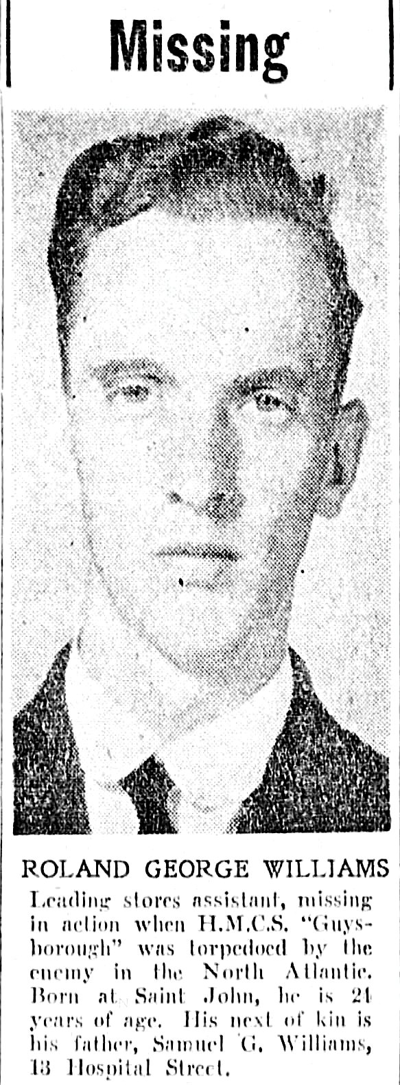 WILLIAMS, Roland George LSA, V33660, RCNVR MPK - 18 Mar 1945 - HMCS GUYSBOROUGH - Son of Samuel G. and Alice M. Williams, of Saint John, New Brunswick.