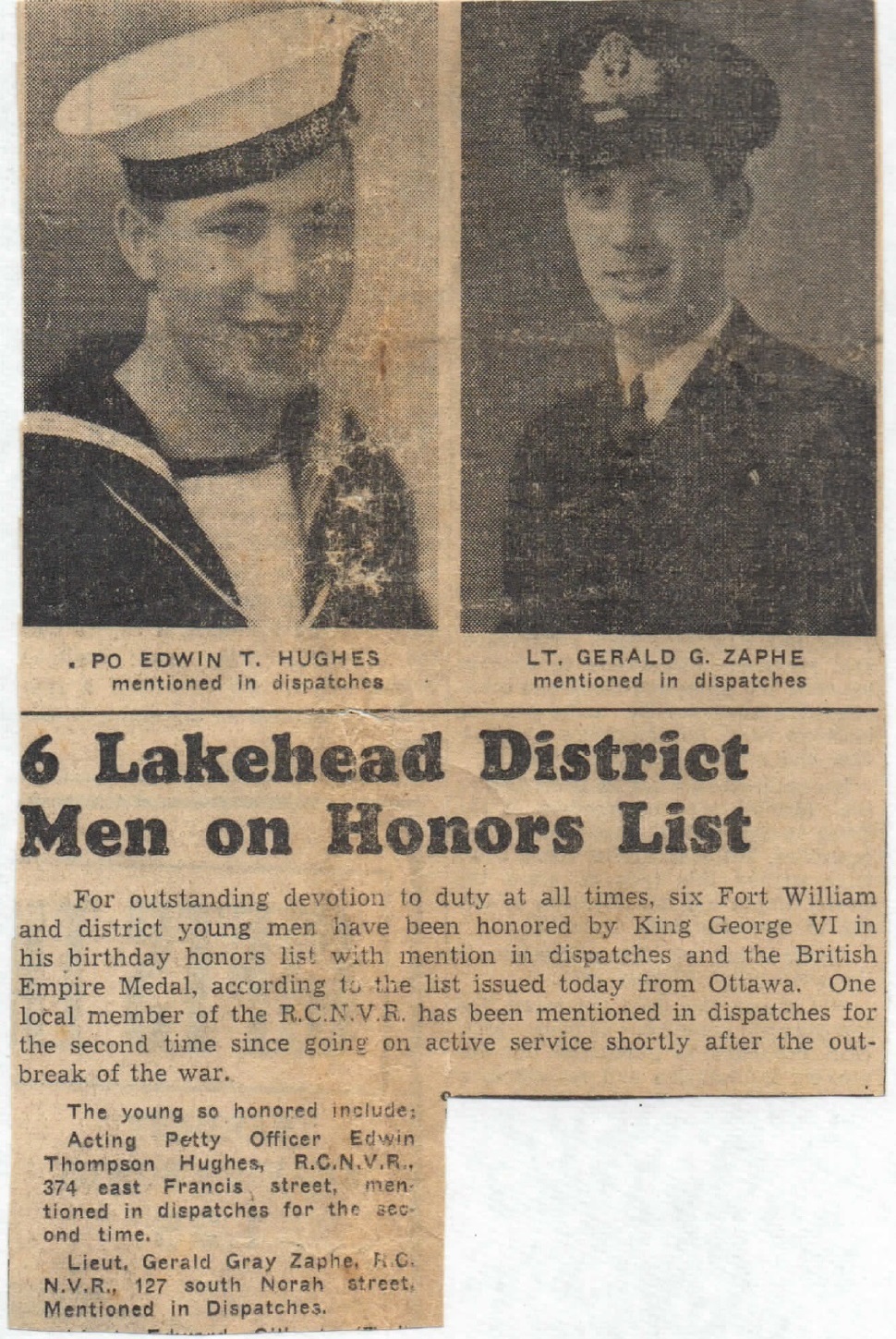 ZAPHE, Gerald Gray, Lieutenant, Mention in Despatches, RCNVR, HMCS ROSTHERN - Awarded as per Canada Gazette of 16 June 1945 and London Gazette of 14 June 1945.