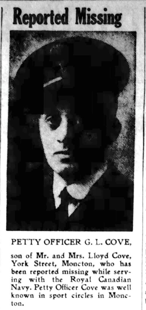 COVE, Gilbert Lloyd, Engine Room Artificer 4c, V26057, RCNVR, MPK - 10 Feb 1942, HMCS SPIKENARD - Son of Lloyd and Muriel Mabel Cove, of Moncton, New Brunswick.