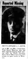 (GLC001) Petty Officer Cover Reported Missing // The Saint John Telegraph Journal 21 Feb 1942 // Courtesy of Operation Picture Me (GLC002) Service File for Gilbert Cove // Source: The Library and Archives of Canada