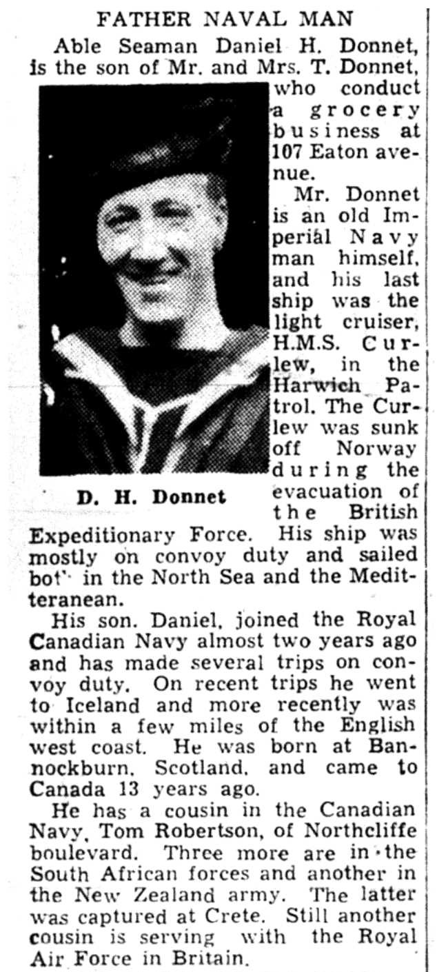 Able Seaman Daniel Heron Donnet was a native of Scotland, Able Seaman Donnet, age 30, is a member of a family which has contributed many men to the armed forces of the empire. His father, Thomas Donnet, Eaton Ave. grocer, served on H.M.S. Curlew, a light cruiser, in the last war and he has seven cousins in various services now. One, with the New Zealand army, is a war prisoner; three are serving with the South African army, one is in the British army, one is in the R.A.F. and still another is in the Royal Canadian navy. Before enlisting with the navy in October, 1940, Donnet worked in his father's shop. He came to Canada from Scotland with his parents, brother Robert and sister Isabel in 1929. He spent his last leave here in late October and since then has written regularly, his last letter reaching the family Feb. 09, 1942.