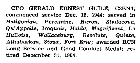Ships served in: (RCNVR) HMS YORK HMS GNAT HMS TERROR Ship's served in: (RCN) HMCS FORT ERIE - Served in FORT ERIE as Cox'n 1963-1964