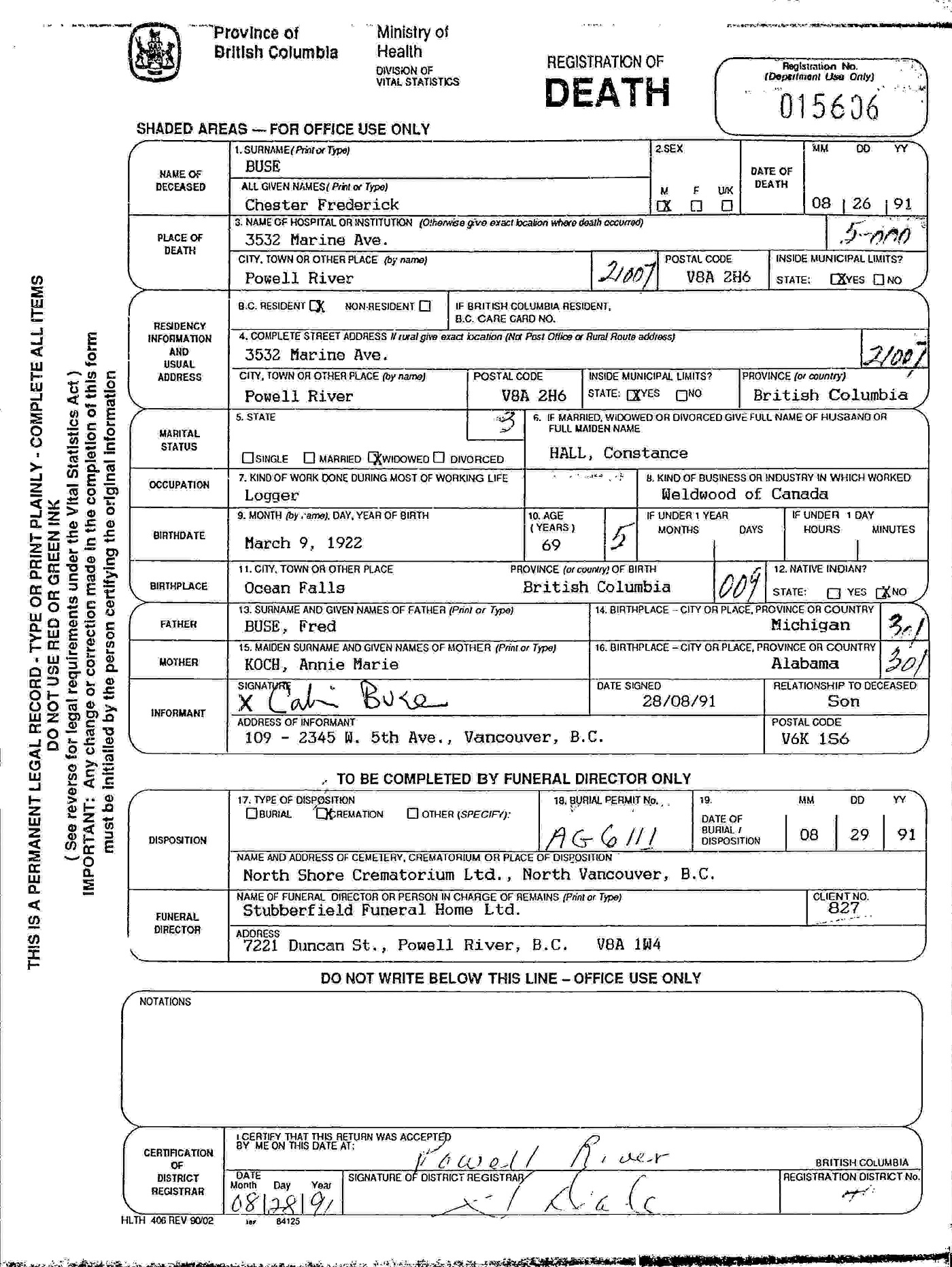 Chester was a son of Fredrick and Annie Buse. He had a brother Irvine and sister Irene. Chester served in the Fishermen's Reserve during the Second World War from 11 Aug 1942 to 23 Aug 1943. He enlisted in the Canadian Army in Vancouver on 13 Mar 1944 (Service Number: K-608686). He married Constance Marle Hall (1925-1976) in Powell River, BC. They had a son Daniel Conrad Frederick Buse (1957-1959), and a daughter Colleen Marle (née Buse) Coppin (1958-2020). Chester was cremated. The location of his ashes are unknown.