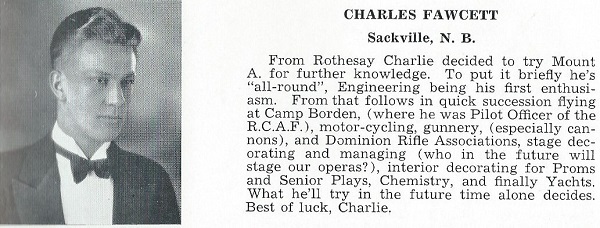 With the onset of WWII Charles Fawcett joined the Royal Canadian Navy Volunteer Reserve (R.C.N.V.R.) in Montréal and was stationed there when he married Ella Grant in July 1940. Having been an ex-officer of the R.C.A.F. at Camp Borden he entered the Navy as a Lieutenant, initially serving as an instructor then transferring to Saint John, NB, in the spring of 1941 in the examining and signaling service. Later in 1941 he was stationed in Halifax and in January, 1942, transferred to St. John's, NL, to join the crew of corvette HMCS Spikenard. He was a native of Sackville, New Brunswick. He was a graduate of Rothesay Collegiate School and Mount Allison University. Before the war he was employed by Canadian Vickers, Ltd., for several years.
