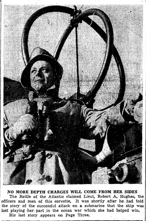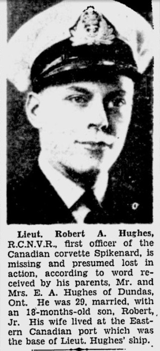 Lieut. Robert A. Hughes, RCNVR, first officer of the Canadian corvette Spikenard, is missing and presumed lost in action, according to word received by his parents, Mr. and Mrs. E.A. Hughes of Dundas, Ont. He was 29, married, with an 18-months-old son, Robert, J. His wife lived at the Eastern Canadian port which wast the base of Lieut. Hughes' ship.