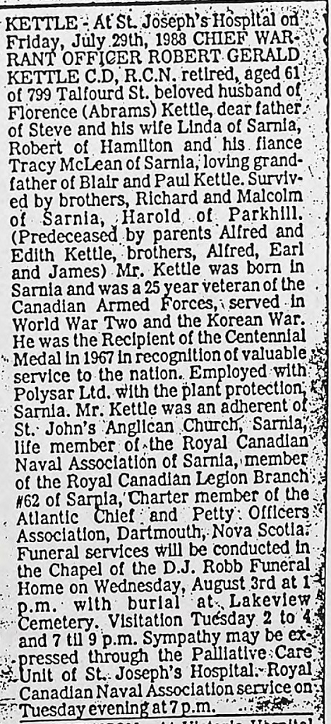 Robert's brother, CPO Alfred S. Kettle, died during the Second World War when HMCS SPIKENARD was sunk.