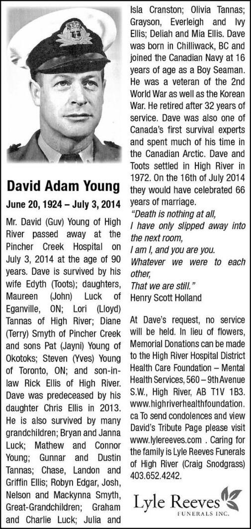 Ships served in: * Enlisted as a Boy Seaman 01 Jul 1940. Commenced Active Service 16 Jul 1940 HMCS ANNAPOLIS - Served in ANNAPOLIS in 1941 HMCS KOOTENAY - Served in KOOTENAY in 1943 * Rated AB SD 1943 HMS RAVEN - Served in RAVEN for Safety Equipment Course in 1946 HMS EGLINTON - Served in EGLINTON in 1947 HMCS MAGNIFICENT - Served in MAGNIFICENT in 1948 * CFR 01 Sep 1955 HMCS HAIDA - Served in HAIDA in 1960 HMCS BEACON HILL - Served in BEACON HILL in 1961 as OpsO * Retired 01 Jul 1972