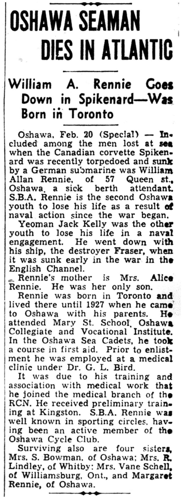 RENNIE, William Allen, SBA, V18336, RCNVR, MPK - 10 Feb 1942, HMCS SPIKENARD - Son of Herbert H and Alice A. Rennie, Oshawa, Ontario.