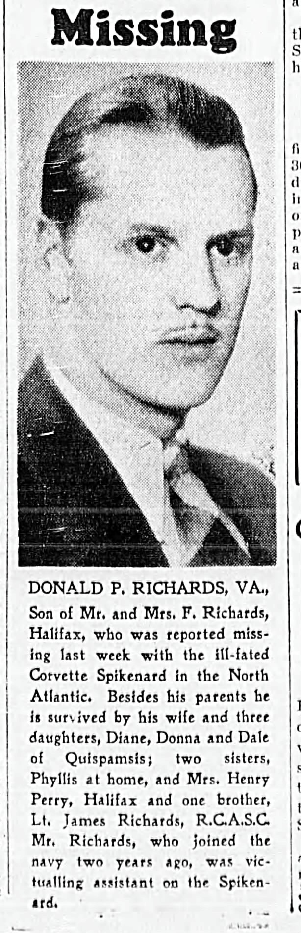 VA Richards died when his ship, HMCS SPIKENARD, was torpedoed and sunk by U-136, about 465 nautical miles west of Malin Head, Ireland while escorting convoy SC-67. Of her crew of 65, there were only 8 survivors.