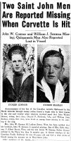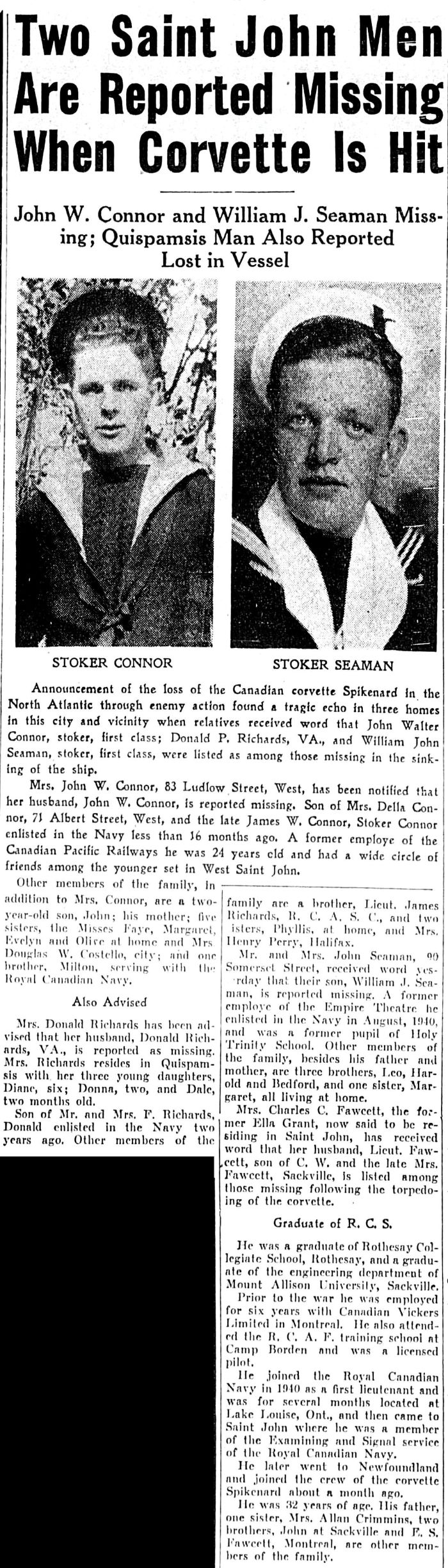 (DPR001) VA Donald Richards Reported Missing // Courtesy of Operation Picture Me (DPR002) Stoker John Walter Connor; VA Donald Richards, Stoker William John Seaman, and Lt Charles Fawcett - missing // The Saint John Times Globe // Courtesy of Operator Picture Me (DPR003) Service file for Donald Richards // Source: Library and Archives of Canada