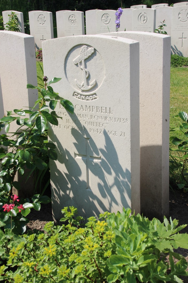 Leading Seaman Campbell served aboard the Corvette HMCS Eyebright before joining Combined Operations at HMS QUEBEC, a training station near Inverary, Scotland. He was Coxswain on the plywood Higgins boat #R45 ordered to carry troops to Dieppe on August 19, 1942. He was seriously wounded in the upper legs, by heavy calibre machine guns during the raid and taken prisoner. He was given medical attention and endured amputation but died in Berlin, on October 21, 1942, age 21.