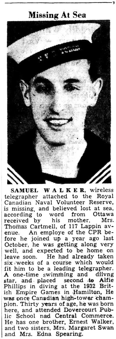 Telegraphist Samuel Charles Walker, age 30, word was received by the family that Sam Walker of Lappin Ave., is reported missing at sea. He is a former Canadian Champion Swimmer and diver. Telegraphist Walker, an accountant with the C.P.R., made radio a hobby in peacetime and joined the navy in 1940 as a wireless operator. He left Toronto in November, 1940, and since has been almost constantly on convoy duty. He was in Plymouth during the heaviest "blitz" raids. A well-known sprint swimmer and diving star, Walker was once Canadian high tower champion. He placed second to Alfie Phillips in diving competitions at the British Empire Games in Hamilton.