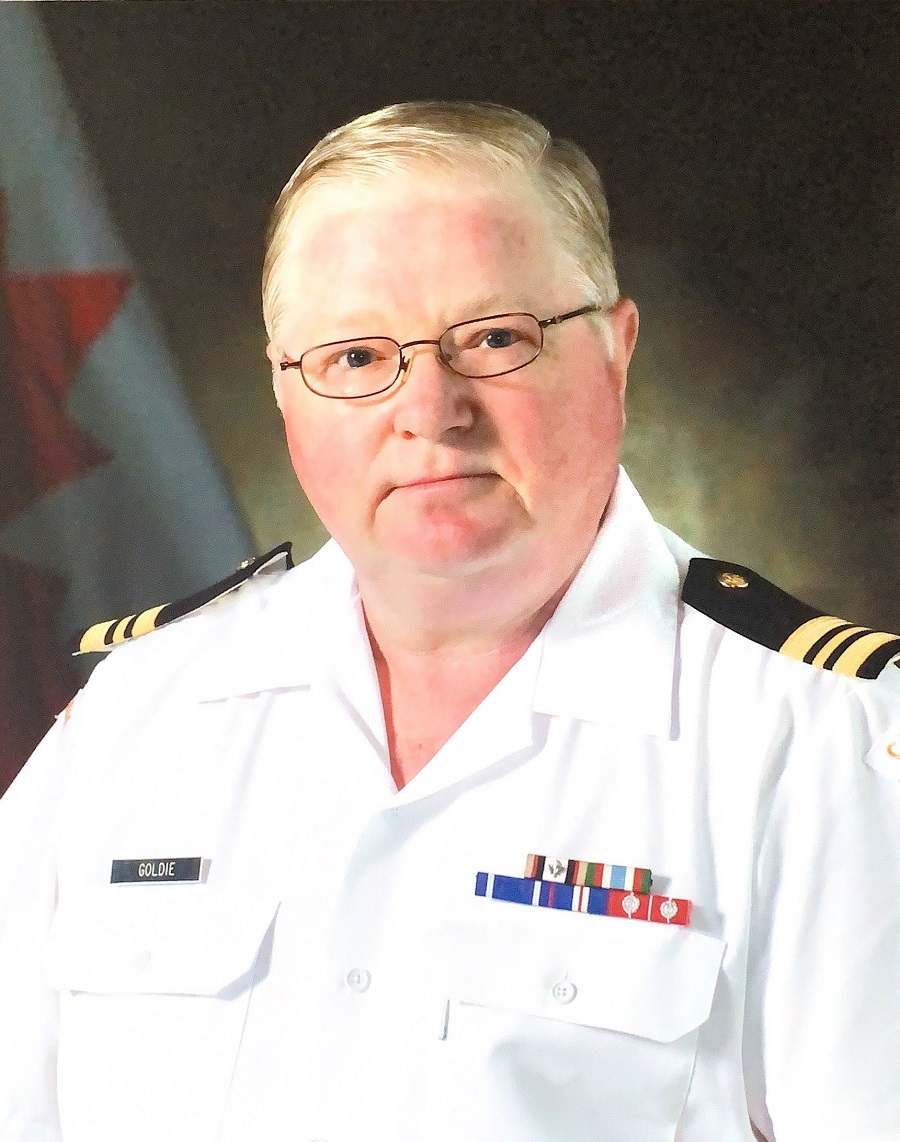 Lieutenant Commander John Goldie's distinguished Naval career spanned 37 years of honourable service onboard HMC West and East Coast ships: KOOTENAY, RESTIGOUCHE, TERRA NOVA, TORONTO, as well as postings to CFB Esquimalt, Halifax, CFS Aldergrove, NDHQ in Ottawa. He served during several global deployments/conflicts including the Gulf War. A conscientious, dedicated, and responsible serviceman, his talents, knowledge and expertise were recognized early in his career and enabled him to rise quickly through the ranks and to being commissioned from the ranks. This unique vantage point, coupled with his devoted leadership and untiring contributions, earned him the respect of a seasoned Naval Officer.