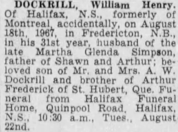 DOCKRILL, William Henry - of Halifax, NS, formerly of Montreal, accidentally, on August 18th, 1967, in Fredericton, NB, in his 31st year, husband of the late Martha Glenda Simpson, father of Shawn and Arthur; beloved son of Mr. and Mrs. A. W. Dockrill and brother of Arthur Frederick Dockrill of St. Hubert, Que. Funeral from Halifax Funeral Home, Quinpool Road, Halifax, NS, 10:30 a.m., Tues., August 22nd. (The Montreal Star 21 Aug 1967 // Researched by Elizabeth Taylor, Courtesy of George Newbury)