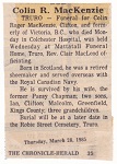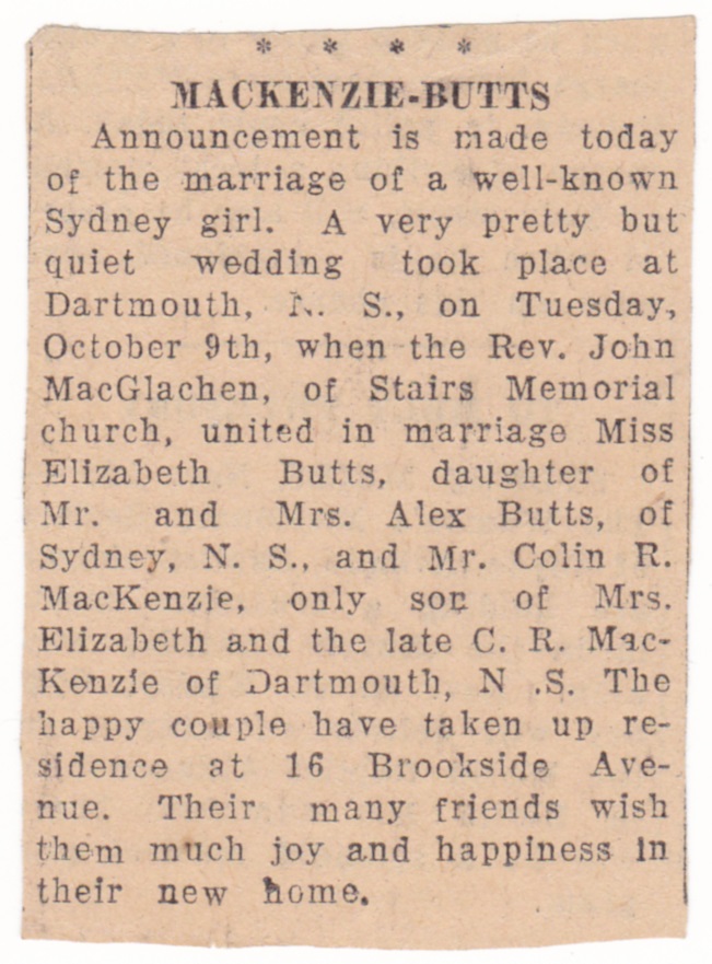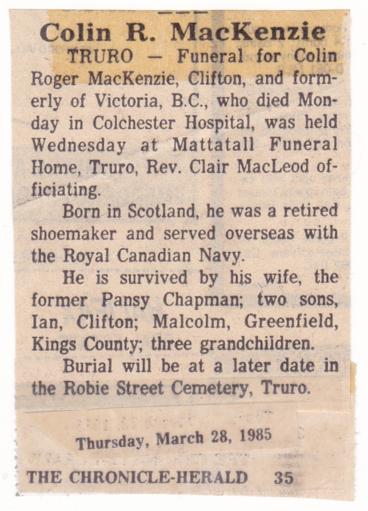 MacKENZIE, Colin Roger - 77, Clifton Nova Scotia, died March 25th 1985 in Colchester Hospital, Truro Nova Scotia. Funeral was held Wednesday 27 March at Mattatall Funeral Home, Truro, Rev. Clair MacLeod officiating. Internment will be at the Robie Street Cemetery, Truro. Colin was a retired shoemaker and had served with the Royal Canadian Navy. Colin was born in Auchinleck, Scotland to Colin MacKenzie and Elizabeth (Rodger) MacKenzie. Colin Emigrated to Canada in 1930 from Paisley Scotland arriving in Halifax on board the S.S. Andania. Prior to emigration he had served with the Gordon Highlanders in India. Colin Married Elizabeth Butts in Dartmouth Nova Scotia in 1934 giving his occupation as a Stoker on board the HMCS SAGUENAY. On 28 June 1943 during the Second World War he was commissioned as a Sub Lieutenant. He was assigned to the Naval Shore Patrol in Halifax becoming an acting Lieutenant Commander on 15 Feb 1944. Colin was present during the Halifax VE Riot and gave testimony during the Kellock Inquiry into the Halifax Disturbances. He is survived by Bruce MacKenzie, son of his first marriage; grandson Gregory Bruce; granddaughter Allison Karen, his second wife, Pansy (Chapman) MacKenzie; two sons, Ian, Clifton; Malcolm, Greenfield, Kings County; three grandchildren.