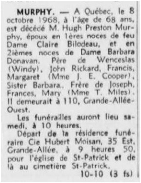 MURPHY, Hugh Preston - In Quebec City, on October 8, 1968, at the age of 68 years, died Mr. Hugh Preston Murphy, husband in first marriage of the late Dame Claire Bilodeau, and in second marriage of Dame Barbara Donovan. Father of Wenceslas (Wendy), John Rickard, Francis, Margaret (Mrs. J. E. Cooper), Sister Barbara. Brother of Joseph, Frances, Mary (Mrs. T. Miles). He resided at 110 West, Grande-Allée. Funeral services will be held Saturday at 10 o'clock. Departure from the funeral home Cie Hubert Moisan, 35 East, Grande-Allée, at 9:50 a.m. to St. Patrick's Church and thence to St. Patrick's Cemetery. (Translation of obituary from L'Action newspaper, 12 Oct 1968, page 17)