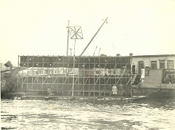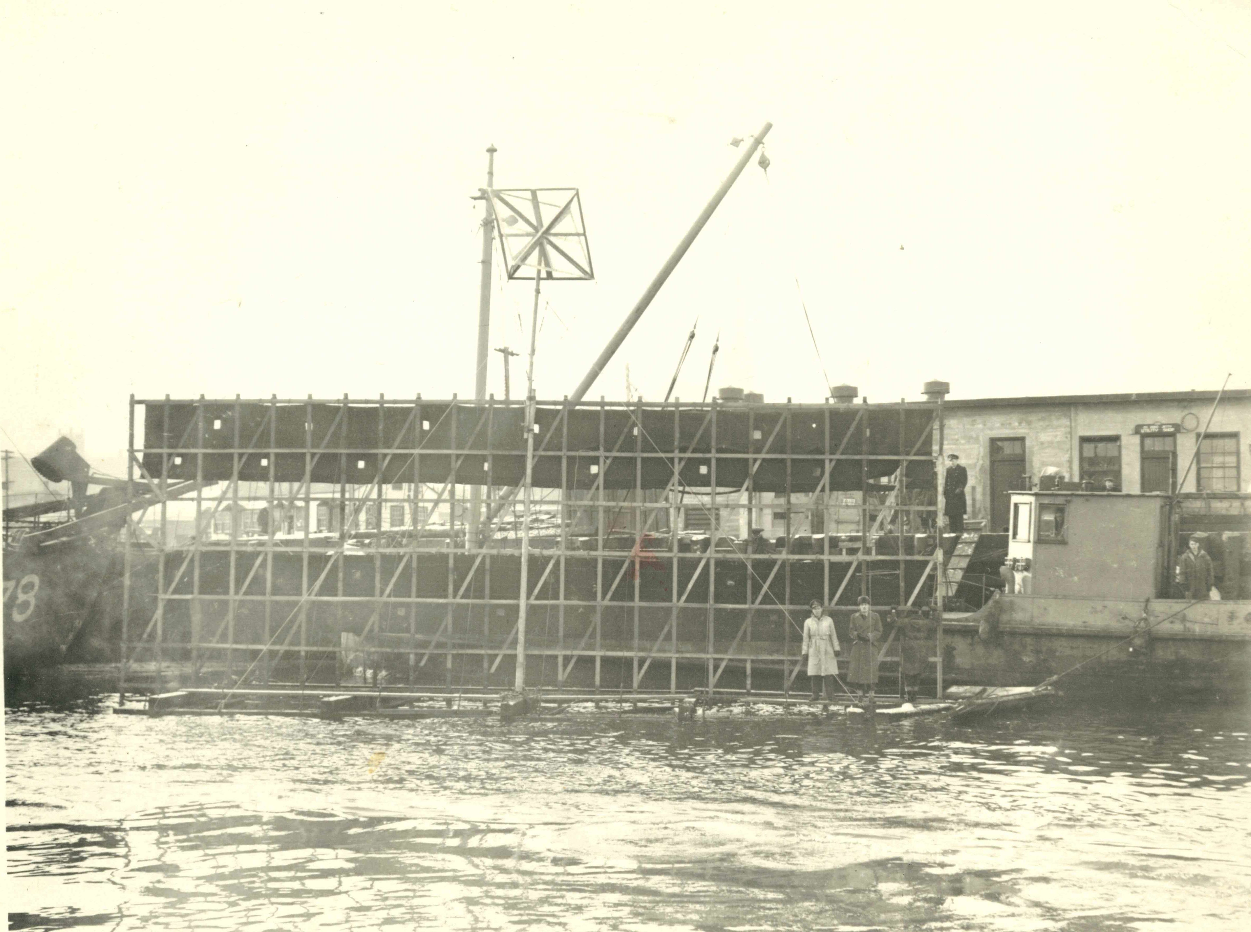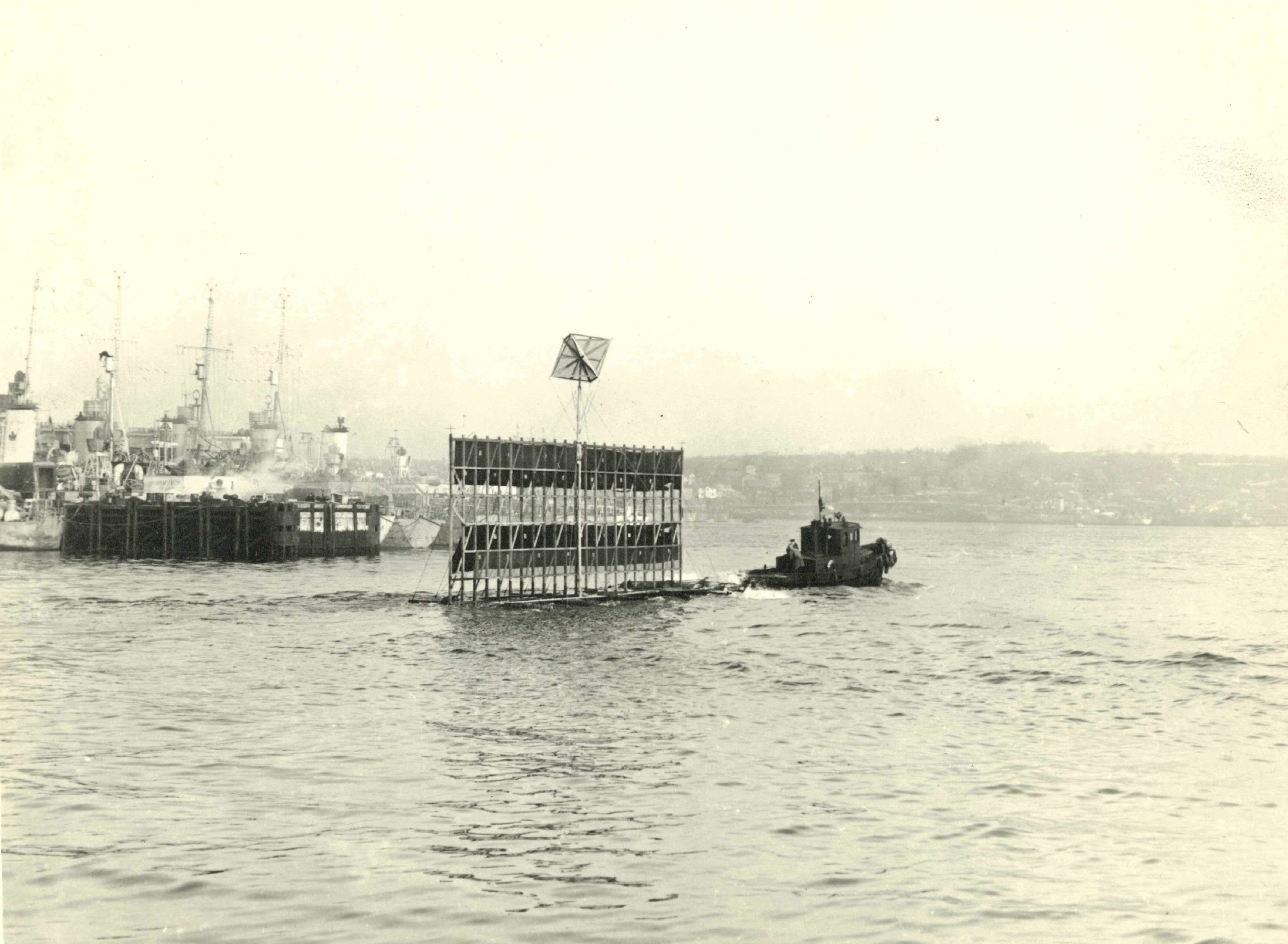 (JMH001) "Involuted Octahedron Reflector" hand made Jan 1943, Halifax, Nova Scotia. The first Radar Target for shipboard Fire Control training. Lt. Hassard (left with light coat) and Lt. Rose (right with dark coat) (JMH002) Tug towing gunnery radar target out to sea