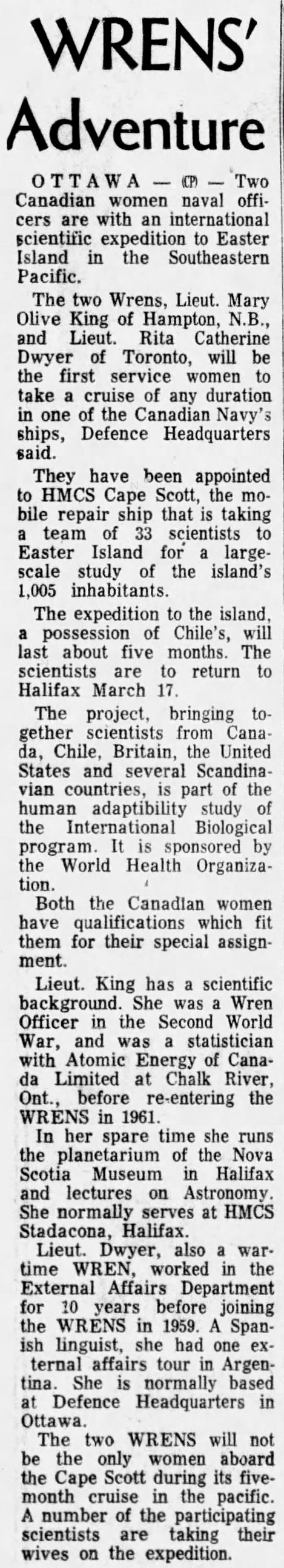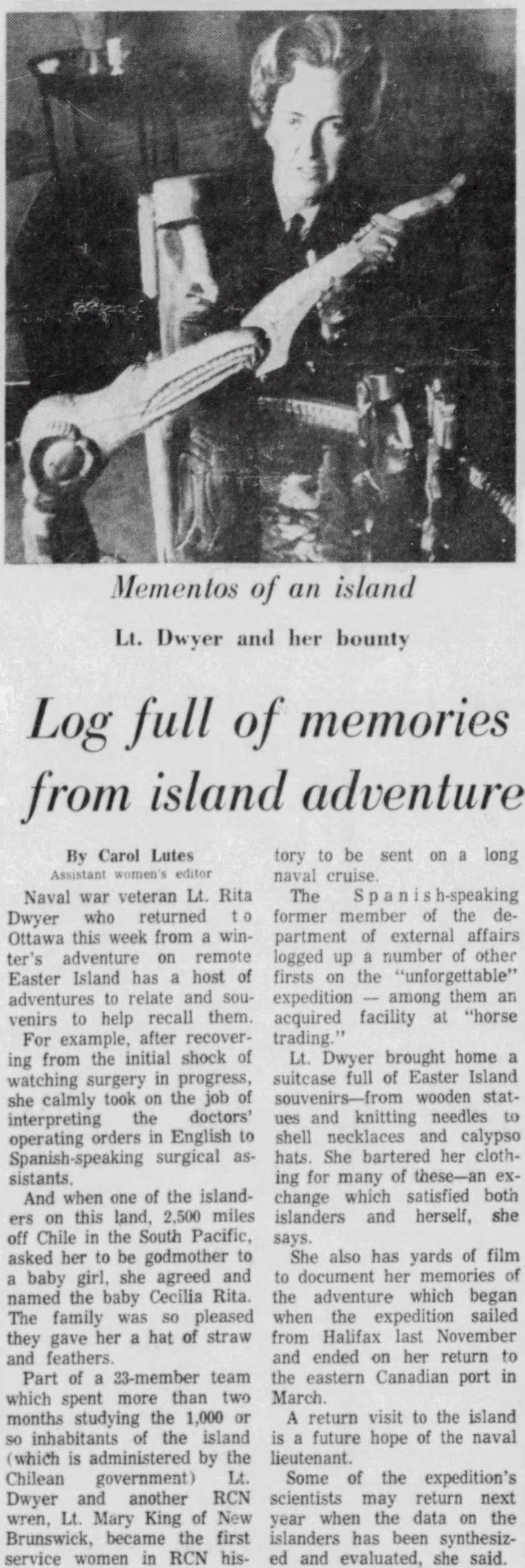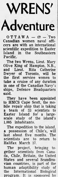 DWYER, Rita Katherine - was born in Toronto, the youngest of eight siblings. She was predeceased by her sisters: Sister Alice Gratia (IBVM), Cecile (Ceal) Annett, Ethel Clarkson, Isabelle Moran, and her brothers: Ray Michael Dwyer, Pvt (WWI), Joseph Dwyer, Lieut, RCNVR (WWII) and Reverend Monsignor Paul Dwyer, pastor of St. Gregory the Great in Oshawa. She is survived by her only nephew, John Annett, his wife Gail, and their children Matthew, Kirsten and Megan Annett. Rita travelled extensively and has friends around the world. Rita graduated from Loretto Abbey, Toronto and Saint Michael's College at the University of Toronto. After working in Cuba, Rita served in the Canadian Navy and then in the Department of External Affairs working with Ambassadors in Argentina, Portugal and Turkey. She returned to Canada and the Navy. A highlight of this tour was her participation in Canada's medical survey expedition to Easter Island. Rita's interests were wide-ranging. She enjoyed skiing, tennis and later lawn bowling. She had a great interest in classical music and art, developed during her years abroad and continued on her return to Canada. Embassy life gave her the opportunity to entertain and she enjoyed her role as a host when Ottawa and Toronto became her homes. Memorial Mass will be celebrated at St. Thomas Aquinas Church, 50 Hoskin Ave., Toronto on Friday, April 1, 2011 at 12:15 p.m. A reception in the adjacent Newman Centre, University of Toronto will follow. Special thanks to Dr. Veenstra, Norma, and the staff at Thorne Mill on Steeles. (The Toronto Star 26 Mar 2011)