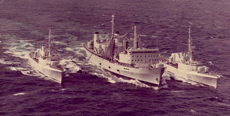 HMCS PRESERVER 510 conducting a RAS with HMCS OTTAWA 229 and HMCS ASSINIBOINE 234