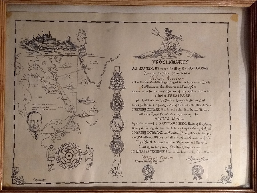 Crossing the Line (Arctic Circle) Certificate for Albert Crocker HMCS PRESERVER 29 Aug 1971
