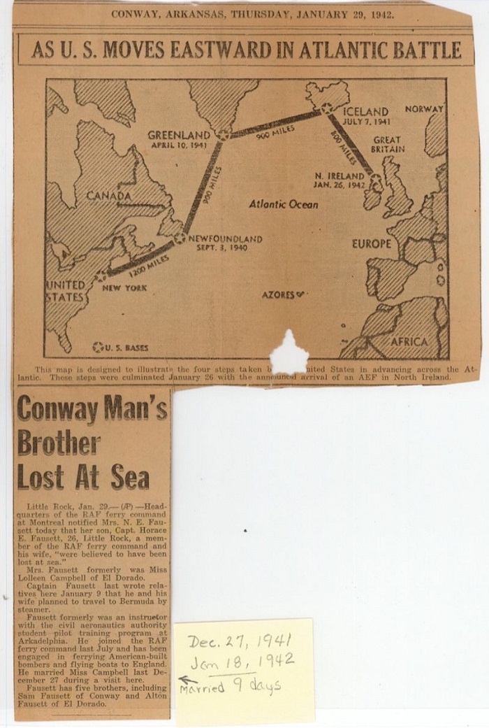 Horace Fausett, a passenger on the Lady Hawkins, died when the ship was torpedoed and sunk on 19 Jan 1942 by U-66. He was a civilian pilot and Captain in the Royal Air Force Ferry Command. Son of the late William H. Fausett and Nancy E. Fausett, of Little Rock, Arkansas; husband of Noleen Carrie Campbell Fausett, of Little Rock. His wife perished with him.