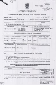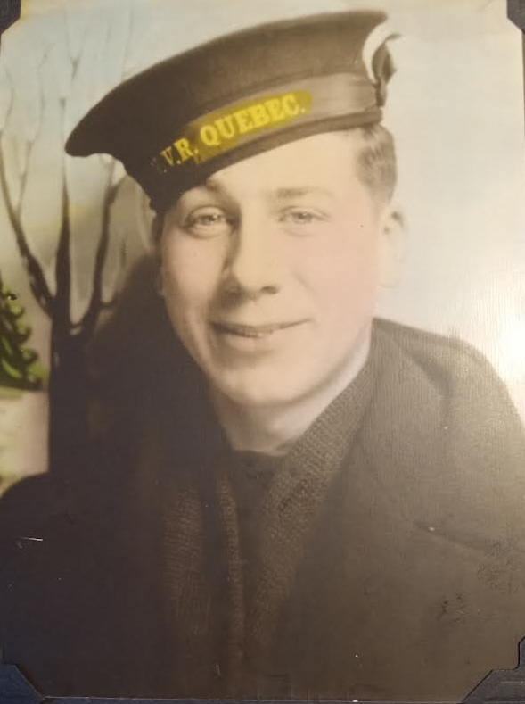 Ships served in: QUEBEC DIVISION RCNVR - Enlisted 16 Aug 1940. Commenced Active Service 16 Sep 1940 as an Ordinary Seaman, RCNVR HMCS STADACONA - Drafted to STADACONA 24 Sep 1940 HMCS ROSS NORMAN - Drafted to ROSS NORMAN 09 Apr 1941 HMCS STANDARD COASTER - Drafted to STANDARD COASTER 13 May 1941 HMCS STADACONA - Drafted to STADACONA 23 Jul 1941 HMCS COLLINGWOOD - Drafted to COLLINGWOOD 24 Jul 1941 * Rated Able Seaman, RCNVR 08 Sep 1941 HMCS STADACONA - Drafted to STADACONA 05 Dec 1942 HMCS KINGS - Drafted to KINGS 07 Dec 1942 * Rated Acting Leading Seaman, RCNVR 15 Apr 1943 HMCS STADACONA - Drafted to STADACONA 10 Jul 1943 HMCS AVALON - Drafted to AVALON - 23 Oct 1943 * Rated Leading Seaman, RCNVR 15 Apr 1944 HMCS FREDERICTON - Drafted to FREDERICTON 16 Jun 1944 HMCS PEREGRINE - Drafted to PEREGRINE 14 Oct 1944 HMCS PROTECTOR - Drafted to PROTECTOR 22 Nov 1944 HMCS PEREGRINE - Drafted to PEREGRINE 26 May 1945 HMCS MONTCALM - Drafted to MONTCALM 12 Jun 1945. Demobilized 19 Jun 1945