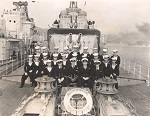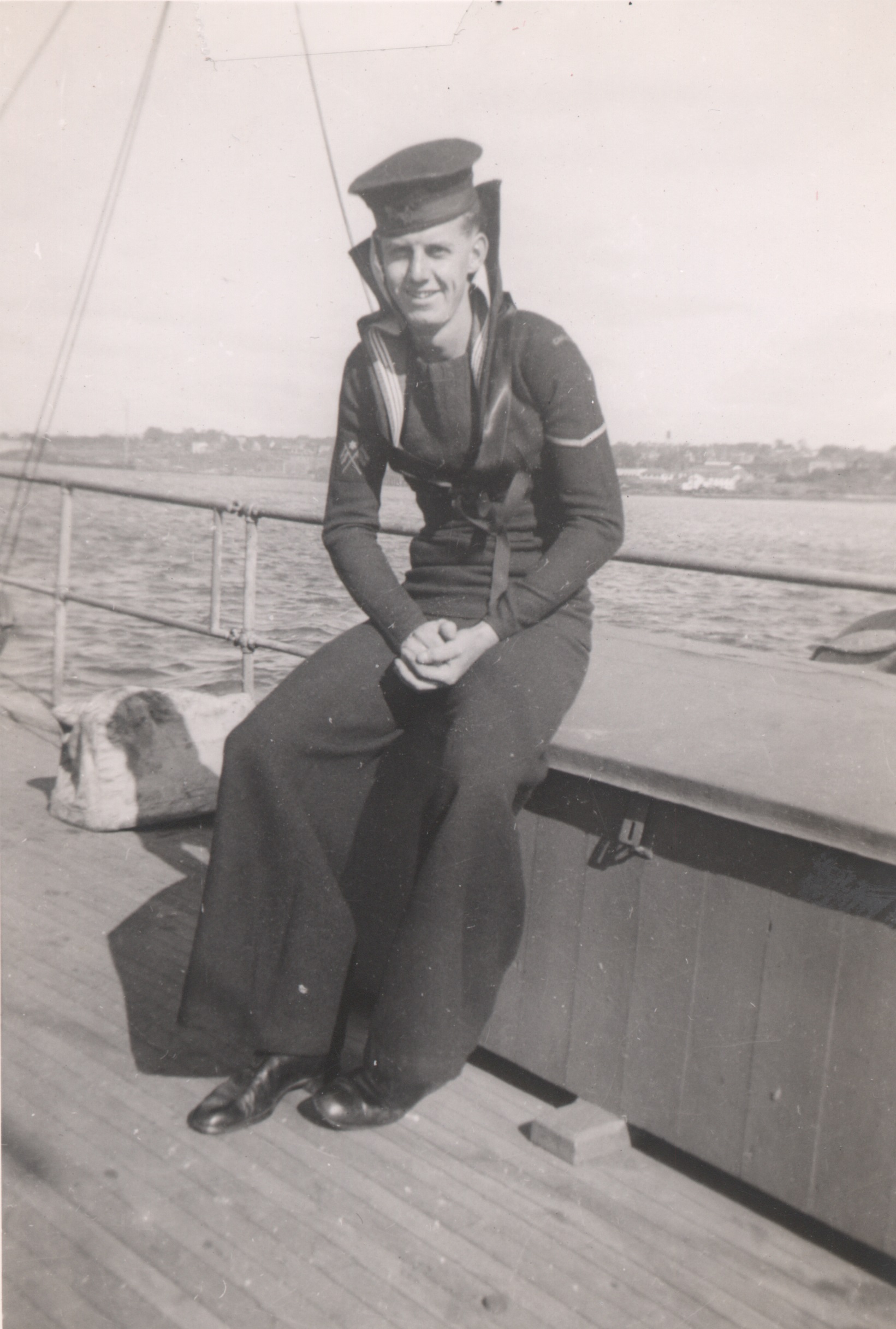 (JR02) Sig (T.O.) John Radley onboard unknown vessel in Halifax harbour during the Second World War. Note that he has his first Good Conduct badge - so he is likely an Able Seaman
