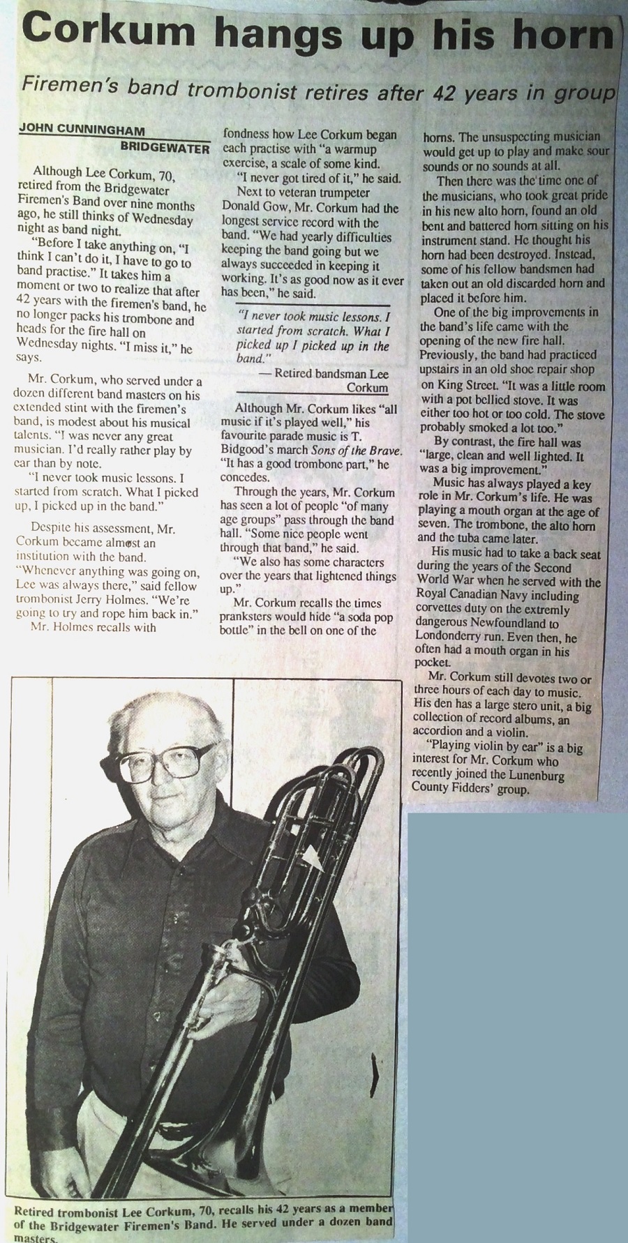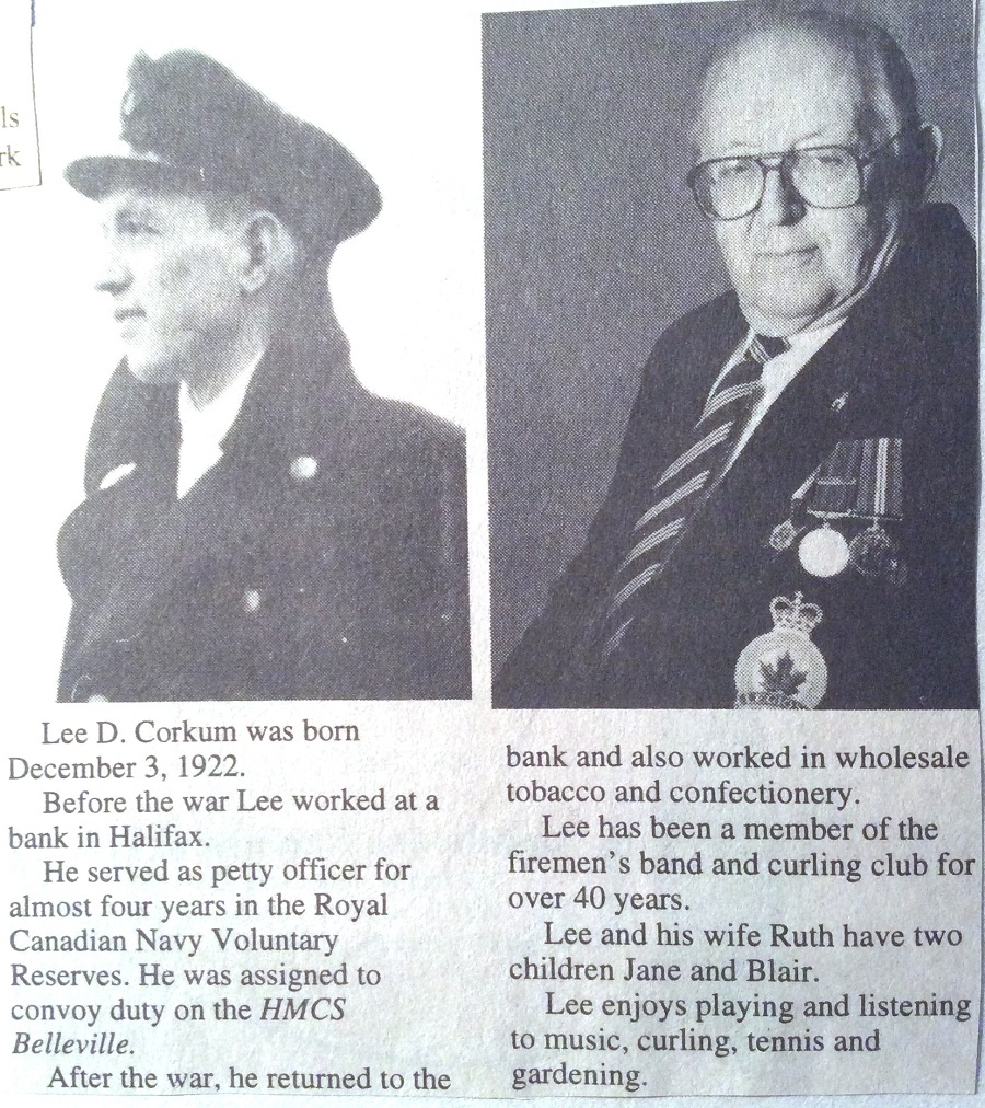 CORKUM, Lee David - 89, of Bridgewater, passed away on Thursday 5 January 2012 in his home. Born in Middle LaHave, he was the son of the late Aubrey and Maud (Mosher) Corkum. Lee was a veteran of World War 2 and was also very active in his community serving with the Bridgewater Volunteer Fire Department Band, the Bridgewater Curling Club and the Royal Canadian Legion. He is survived by his daughter Jane Corkum (Brian Tittle), P.E.I.; son Blair (Loraine) Corkum, Bridgewater; grandsons Tyler and Max along with many nieces and nephews. Lee was predeceased by his wife Ruth; sister Marguerite Harding. There will be no visitation by request. Funeral Mass will be held 11:00 A.M., Tuesday 10 January in St. Joseph’s Roman Catholic Church, Bridgewater, Fr. Brian Murphy officiating. Burial will be in St. Joseph’s Roman Catholic Cemetery. Family flowers only, please. Memorial donations in Lee’s memory may be made to the Heart and Stroke Foundation or the S.H.A.I.D. Animal Shelter.